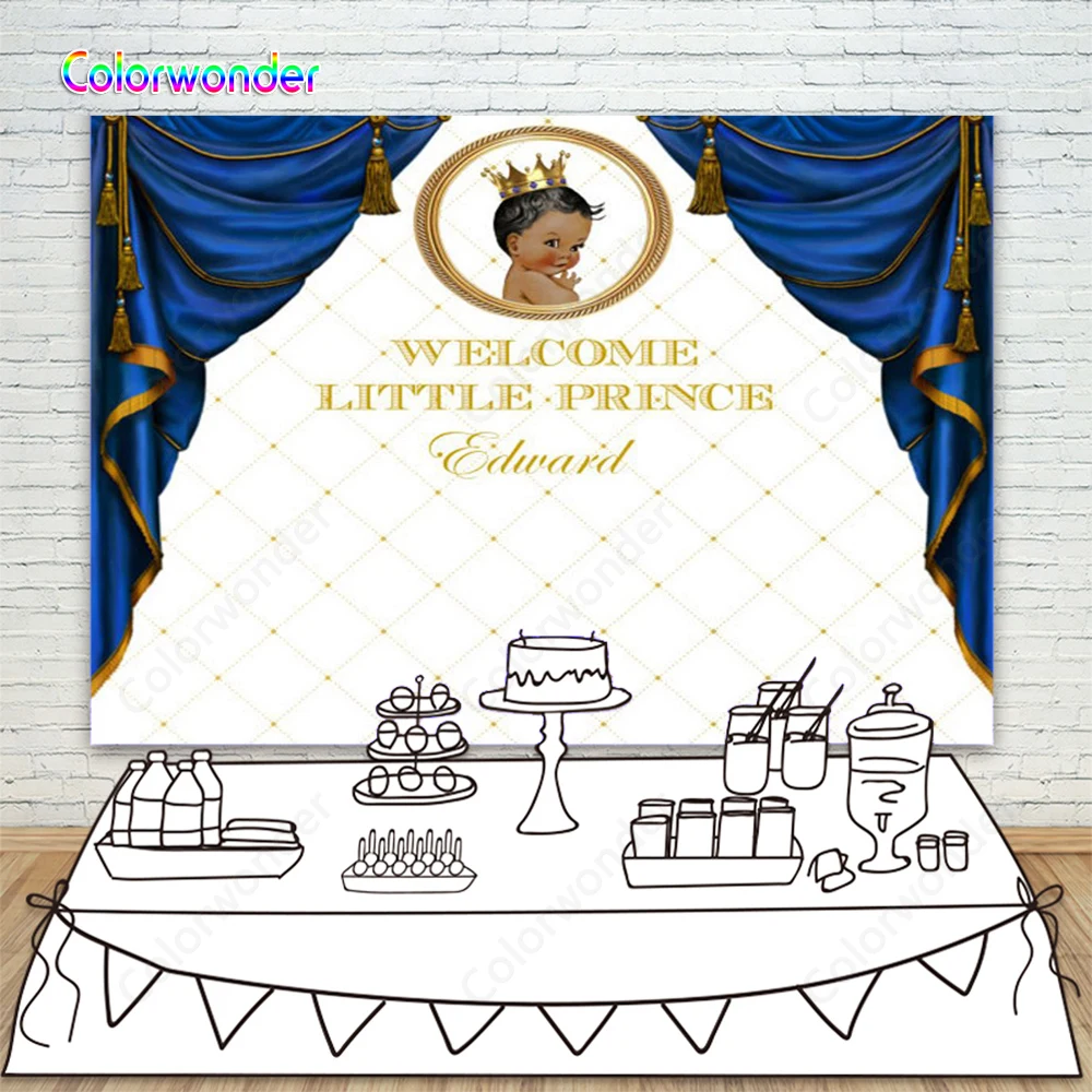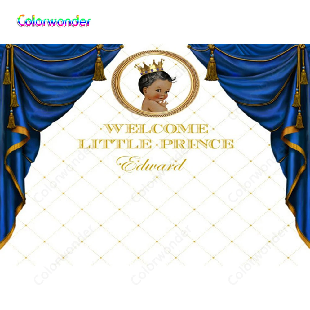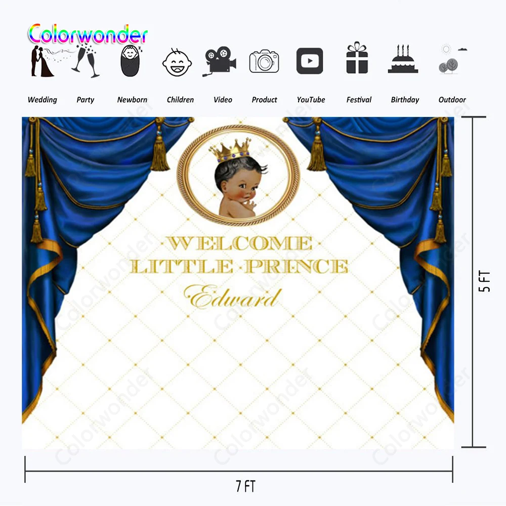 Best Royal Baby Shower Photo Background Blue Curtain White Wall with Gold Lines 7x5ft African Boy with C